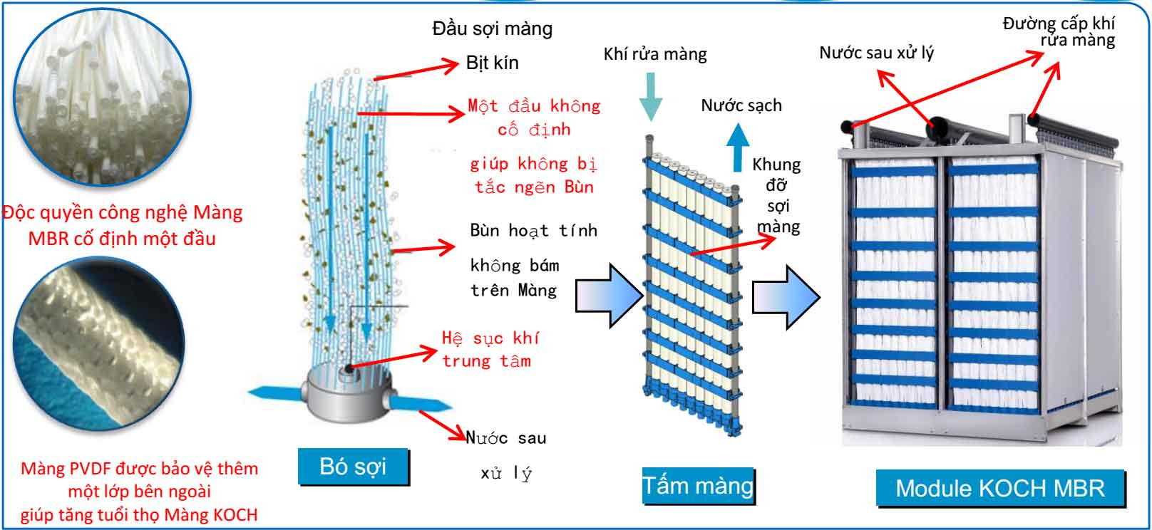 Bề mặt của màng lọc sẽ là nơi giữ lại các chất thải rắn, với kích thước lỗ màng rất nhỏ, chỉ 0,1 micro mẹt nên có thể hoàn toàn giữ lại các chất ô nhiễm độc hại, vi khuẩn, vi rút gây hại,… chỉ cho nước sạch đi qua và lượng bùn được giữ lại để thu gom theo định kỳ.